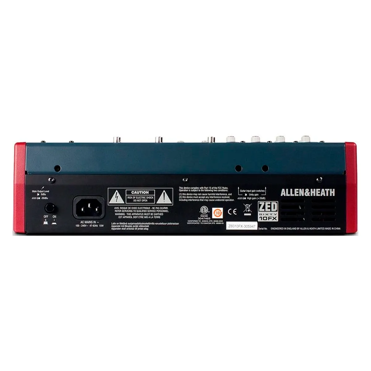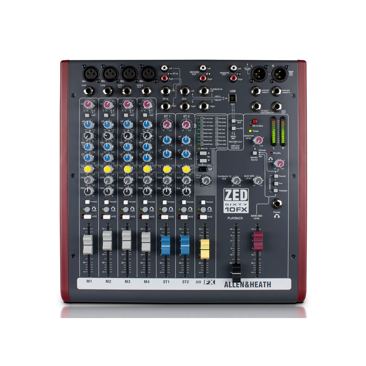 Allen & Heath ZED60-10FX — 10-канальный аналоговый микшер с USB-подключением, который подходит для небольших концертов, студийных записей и подкастов. В нем есть встроенные эффекты для улучшения звучания, а также фантомное питание для работы с конденсаторными микрофонами, простые в использовании настройки эквалайзера и регуляторы громкости.