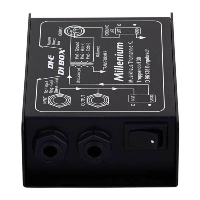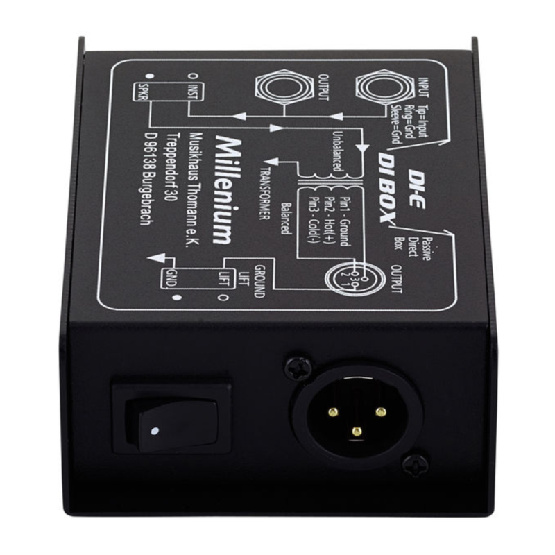 Millenium DI-E — это пассивный DI-бокс, который помогает подключать инструменты и линейные источники к микшеру через XLR. Он преобразует небалансный сигнал в балансный, снижая шумы и улучшая совместимость с профессиональным оборудованием. Устройство подходит для гитар, клавиш, драм-машин и даже усилителей, благодаря переключателю уровней входа. Используется на сцене, в студии и при инсталляциях, когда нужно надёжное и простое решение без лишних функций.