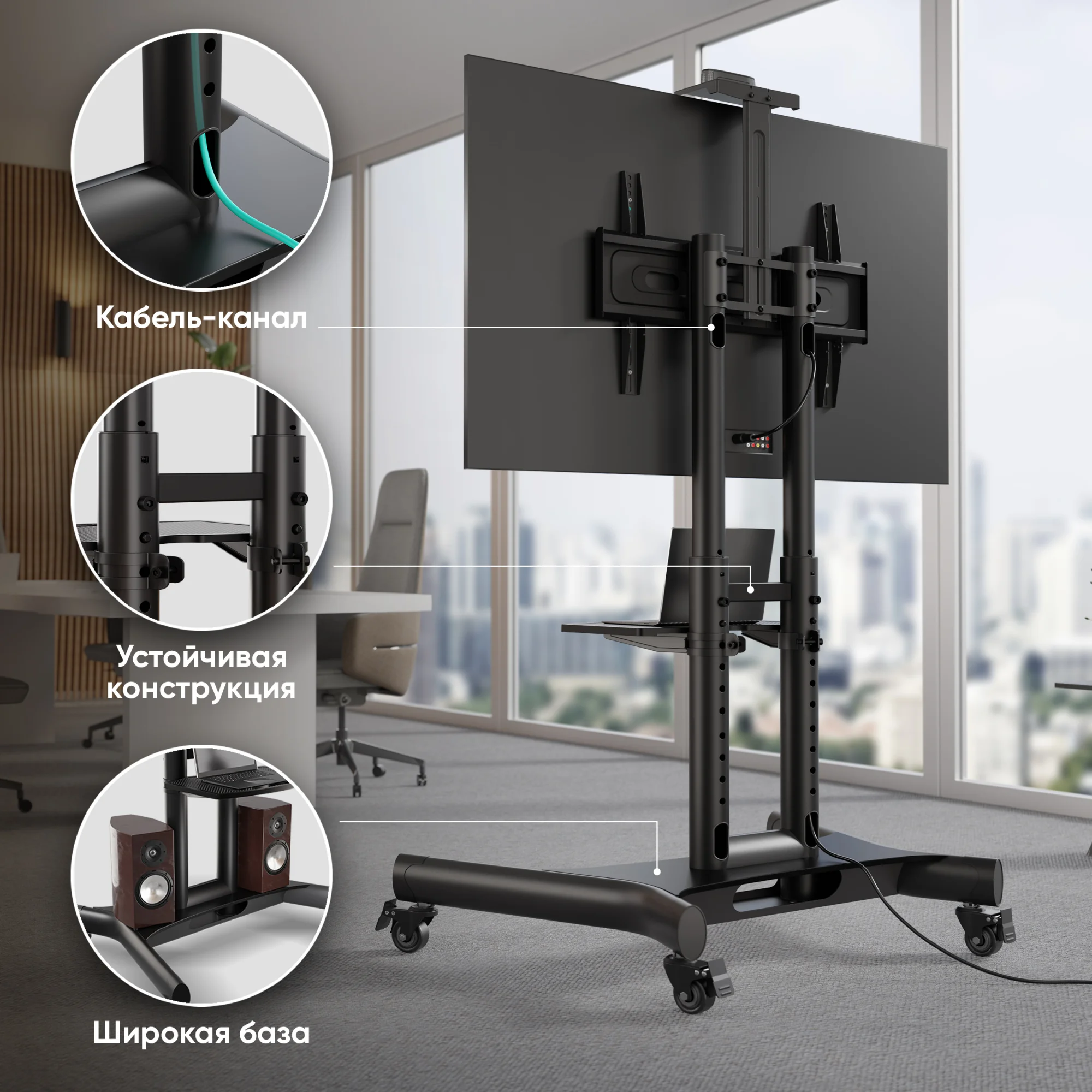 ONKRON TS1551 – профессиональная стойка для телевизоров, идеально подходящая для офисов, учебных заведений, конференц-залов и выставок. Конструкция выдерживает экраны весом до 45.5 кг и оснащена кронштейном для камеры и полкой для ноутбуков или других источников сигнала. Стойка обеспечивает удобную установку и мобильность экрана. Регулировка высоты выполняется легко. Современный дизайн и прочная стальная конструкция делают стенд ONKRON TS1551 идеальным решением для делового и презентационного пространства.